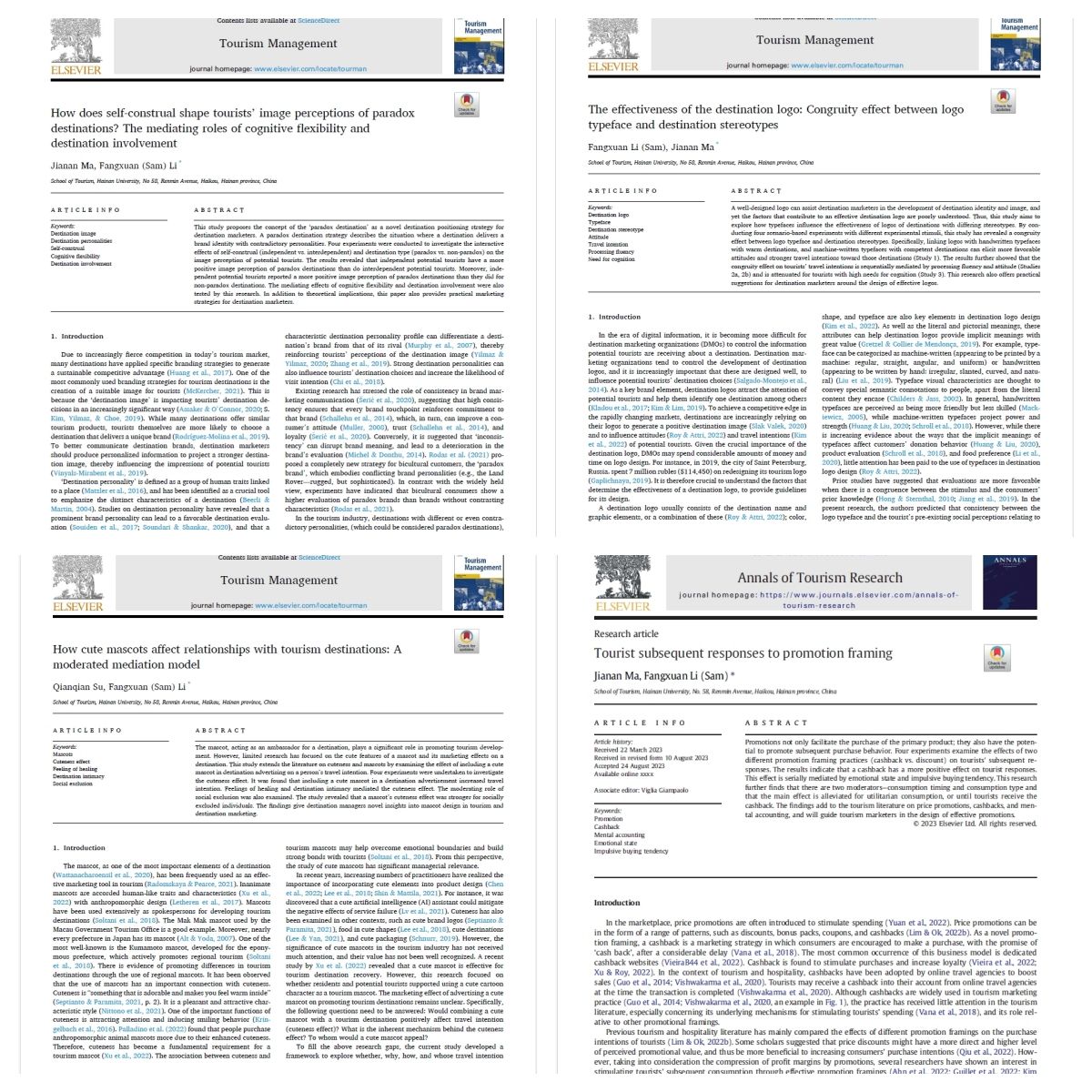 软科世界一流学科排名的5个指标是重要期刊论文数(占比45.5%)、论文标准化影响力(占比15.2%)、国际合作论文比例(占比3.0%)、顶尖期刊论文数(30.3%)和教师获权威奖项数(6.0%)。李芳轩教授于2020年7月引进至海南大学,迄今共以海南大学为第一单位、通讯作者单位在《Tourism Management》《Annals of Tourism Research》《International Journal of Hospitality Management》《Journal of Sustainable Tourism》《International Journal of Contemporary Hospitality Management》等国际高水平期刊发表论文34篇,其中有5篇发表在软科认定的顶尖期刊上,有23篇发表在软科认定的重要期刊上(JCR分区的1区期刊),这两项指标均在我校排名第一。李芳轩教授所发表的论文累计被引用达到720次(谷歌学术Google Scholar,h指数14,i10指数19)。另外,李芳轩教授与新西兰怀卡托大学Chris Ryan教授、奥克兰理工大学Peter Kim教授、中央昆士兰大学Bruce Prideaux教授、澳门旅游学院Leonardo Dioko教授等均有论文合作发表,这也显著提高了海南大学旅游休闲管理学科的国际影响力。