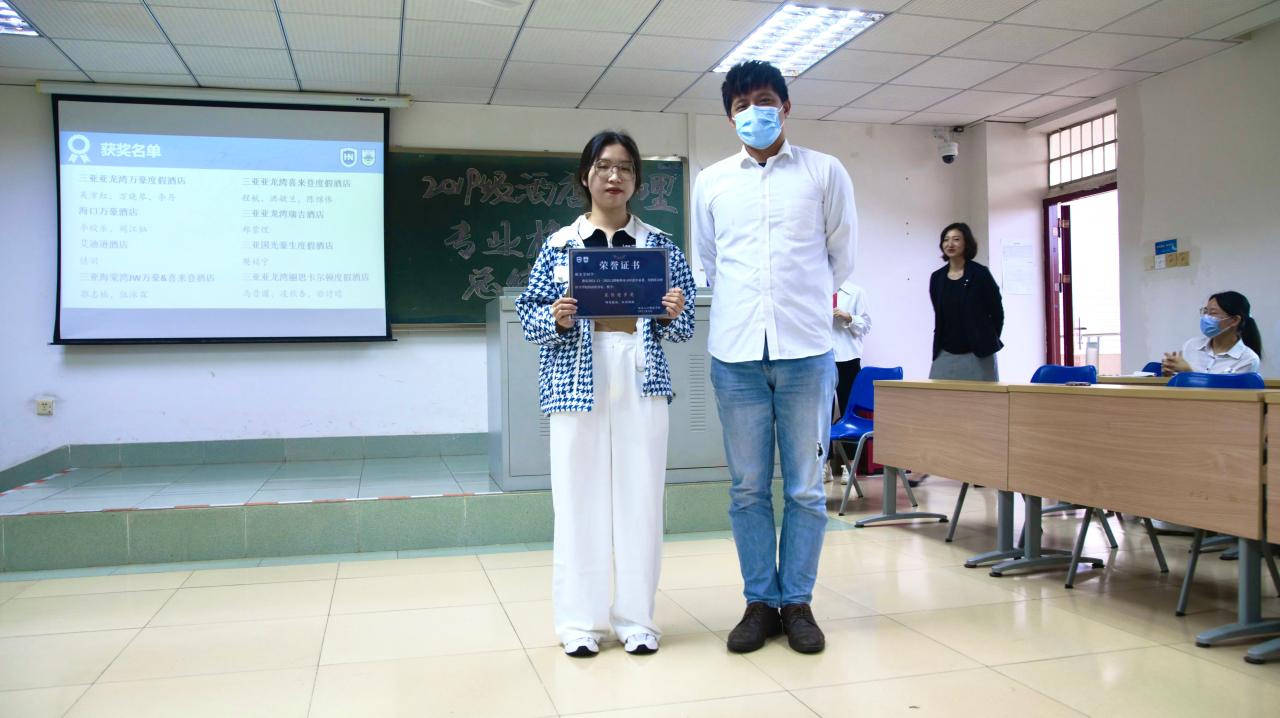 在本次校外专业实习中,涌现出了一批优秀的实习生,他们的表现受到了酒店及学院的高度认可。谢祥项、刘雪莲等四位老师为马晋圆、胡美莹等同学颁发了优秀实习生、最佳组织奖以及最佳进步奖。其中最佳组织奖以及最佳进步奖奖品由华彩华邑酒店特别赞助,华彩华邑酒店总经理邓湘黔先生作为酒店管理专业的客座教授,一直非常关心酒店管理专业学生的实习实践,此次虽不能亲自参加实习分享会,也给同学们带来殷殷祝福。