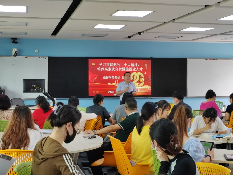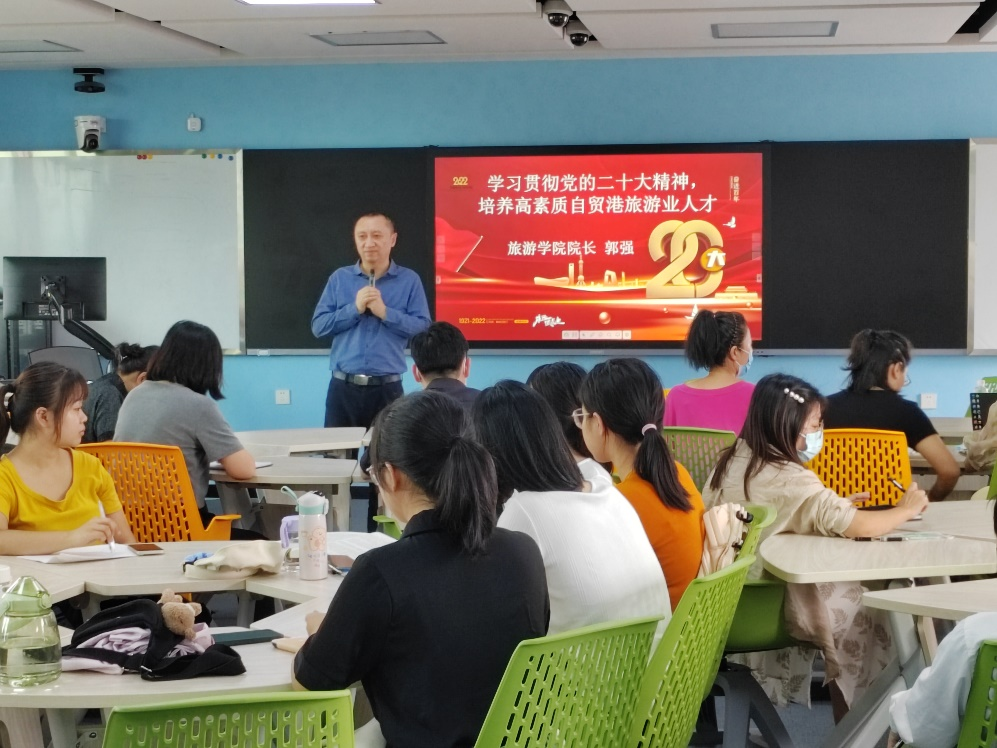 为动员全院师生员工深入学习宣传贯彻党的二十大精神,指导和推动师生员工们认真学习、深刻领会党的二十大精神,切实把思想和行动统一到党的二十大精神上来,为加快学院跨越发展做出新的贡献,11月15日下午,旅游学院党委在8-502教室举办了题为“学习贯彻党的二十大精神,培养高素质自贸港旅游业人才”的首场专题讲座。旅游学院院长郭强教授主讲本次讲座,旅游学院党委书记韩力光主持了讲座,学院部分老师和研究生共50多人到场学习。