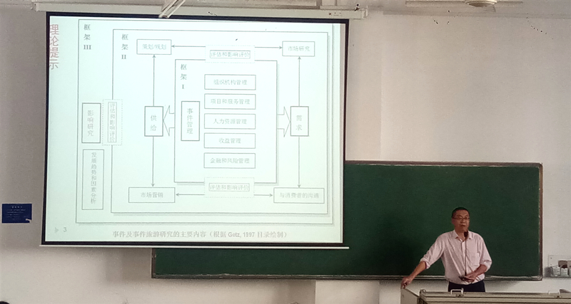 在之后的授课中,戴光全教授以深入浅出的理论阐释,精彩生动的案例分析和幽默风趣的语言,使学生们从多角度了解会展节事的起源、进程及特点,明晰城市化背景下节事旅游的动态发展,掌握城市节庆活动的整合与可持续发展、民族文化视角下会展节事发展等理论知识,为同学们学习相关方面的知识打下坚实基础。在课程讲授中,戴光全教授还向同学们讲授做人与做学问的道理,鼓励大家努力学习专业知识,开拓专业视野,全面提升自己的综合素养。