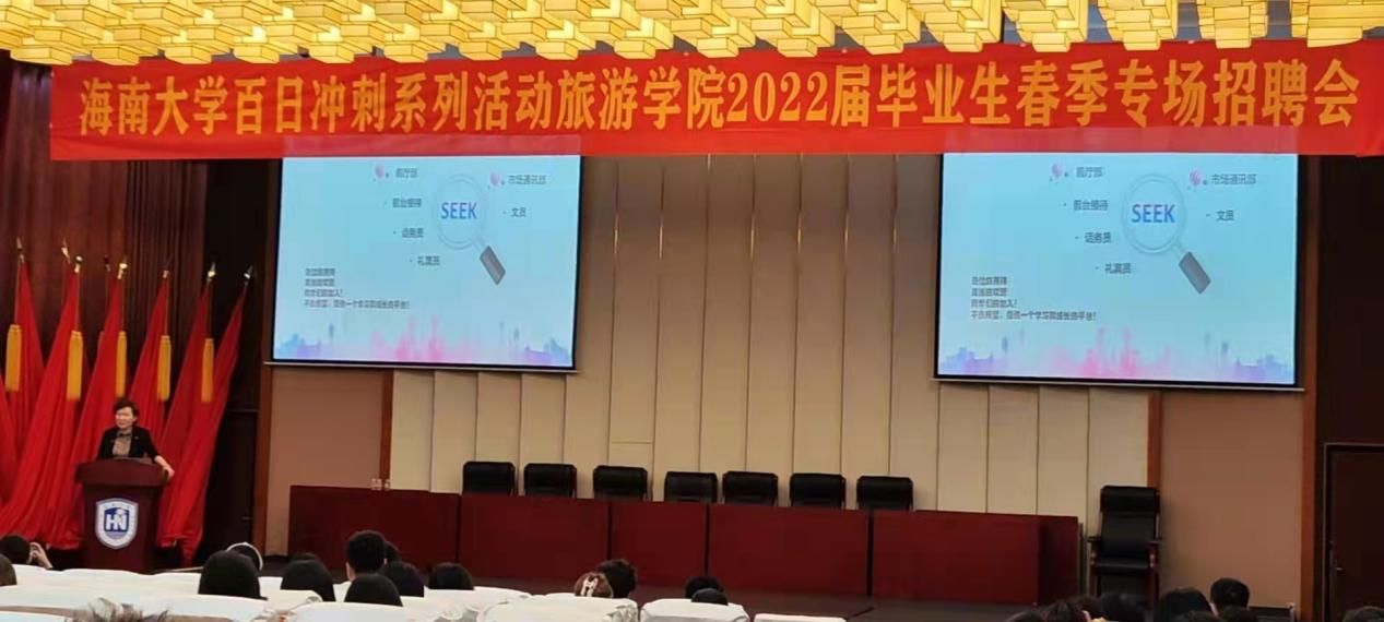 为了有效助力海南自贸港建设,推动旅游产业发展,2022年5月17日下午,海南大学百日冲刺系列活动旅游学院2022届毕业生春季专场招聘会在社科楼2楼会议室召开。旅游学院院长郭强、党委书记韩力光、谢祥项副院长、张珊副院长、各系系主任,今朝书院党委副书记刘莉莉、毕业班就业辅导员参与本次会议。此次招聘会共有11家企业参加,提供超200个岗位,近100名学生参加应聘。