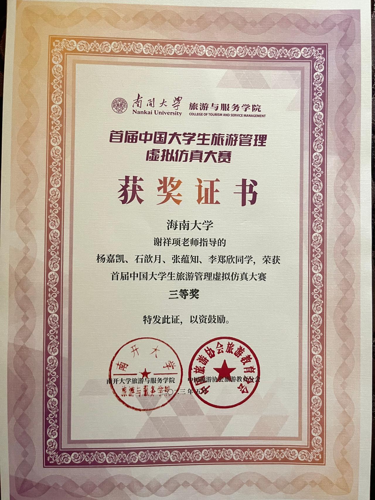 5月25—28日,中国旅游协会旅游教育分会与南开大学旅游与服务学院联合举办的“首届中国大学生旅游管理虚拟仿真大赛”决赛在南开大学线下举办,我院2021级酒店管理专业班杨嘉凯、石歆月、张蕴知、李郑欣等同学组成的“少年先锋队”经过线上对抗和现场答辩等环节的激烈比拼,最终在包括南开大学、厦门大学、华南师范大学、云南大学、北京第二外国语大学、澳门城市大学等在内的84支决赛队伍中荣获三等奖,谢祥项老师荣获“优秀指导老师”称号。