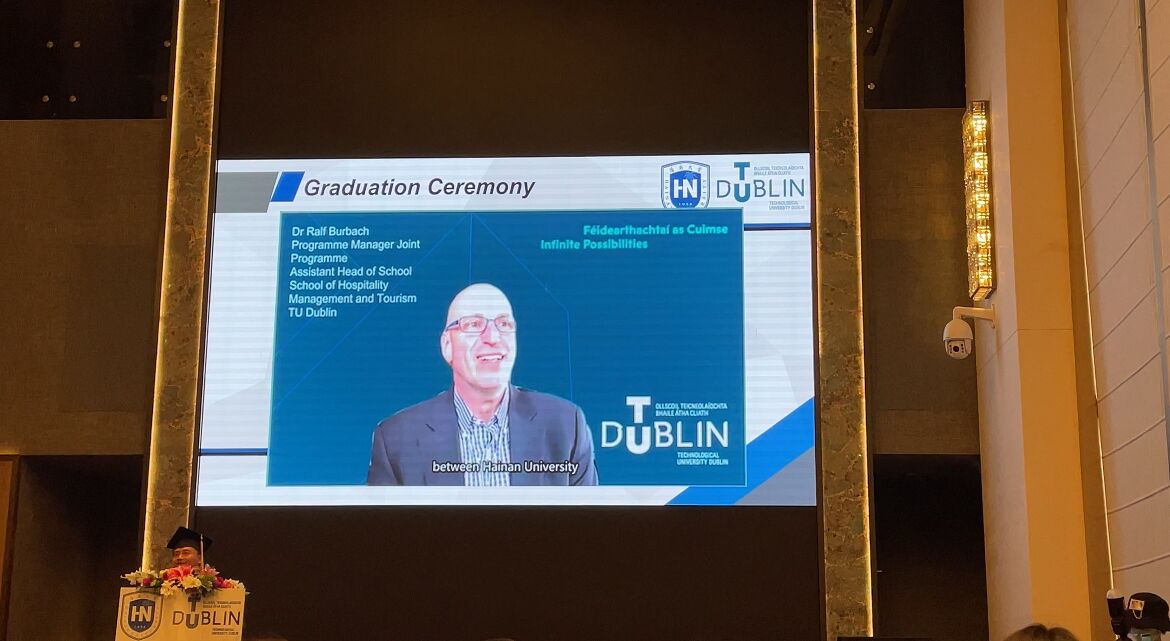 由于受到疫情影响,项目合作方爱尔兰都柏林理工大学(下称“外方”)的领导和老师们遗憾未能亲临典礼现场,为此,外方酒店管理与旅游学院副院长Ralf Burbach特地提前录制好祝福视频,在典礼上播放。他说道,顺利毕业对于2021届毕业生而言是一项了不起的成就,疫情发生后,外方教师无法到中国,无法进行线下授课,学生必须迅速适应远程网络的授课模式,尽管如此,学生仍然将学业完成得很好。通过四年学习,毕业生已具备多种行业的知识与技能,Ralf Burbach副院长衷心祝愿他们毕业后的发展更上一层楼。