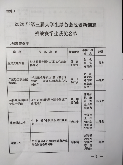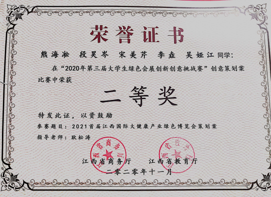日前,由江西省教育厅、江西省商务厅主办的“第三届大学生绿色会展创新创意挑战赛”在南昌隆重举行。由我院耿松涛教授带队指导,2018级会展经济与管理专业熊海凇、段昊岑、宋美芹、吴娅江、李垚五名同学组成的海南大学旅游学院代表队以总成绩第五名,荣获比赛二等奖。