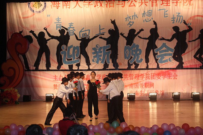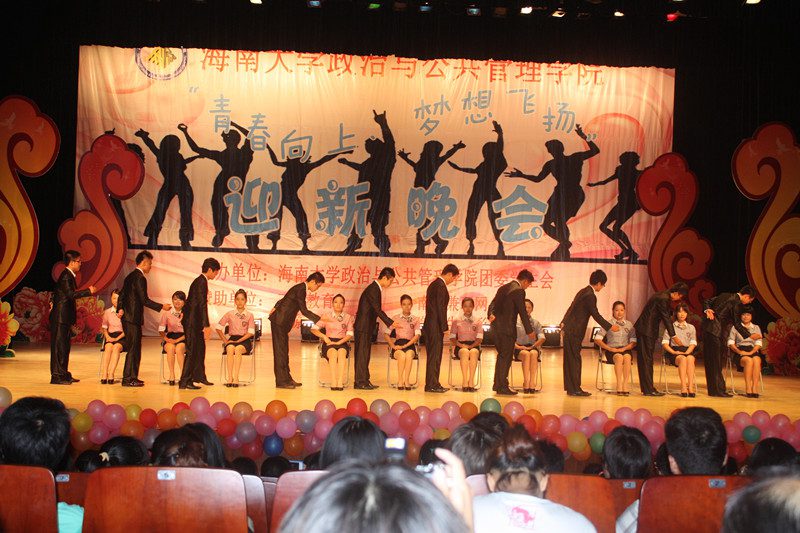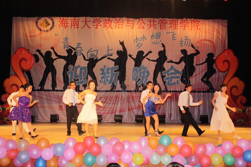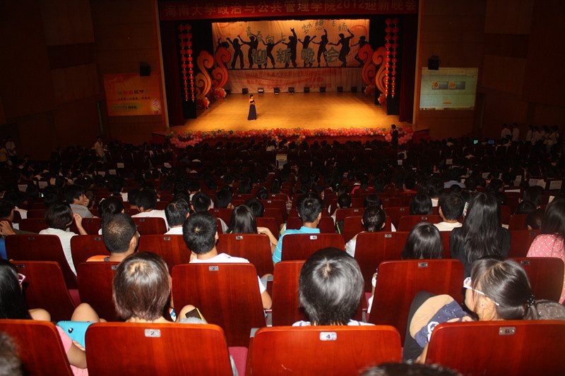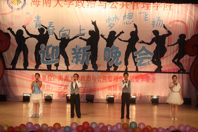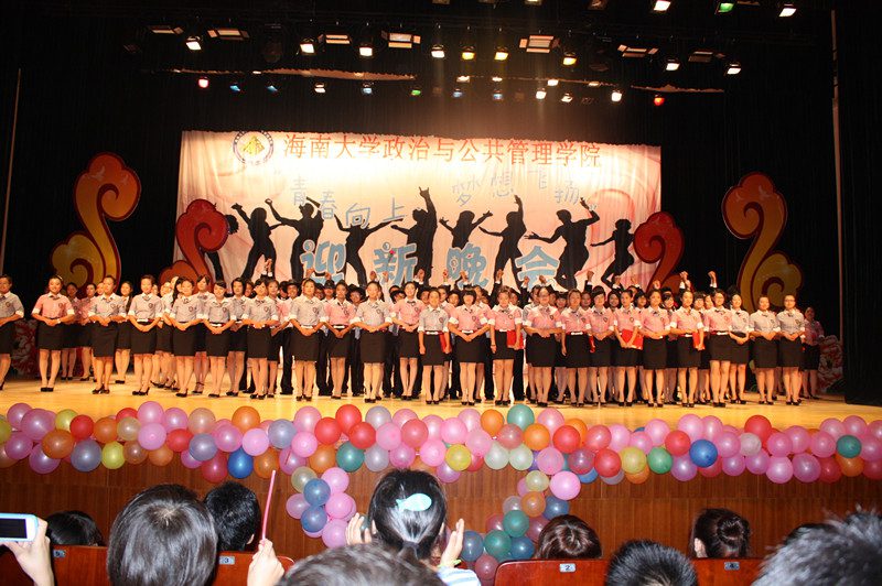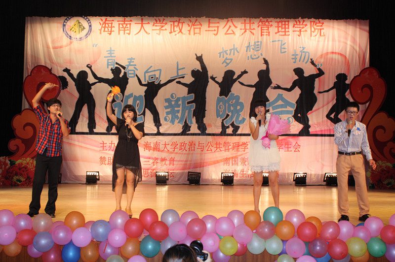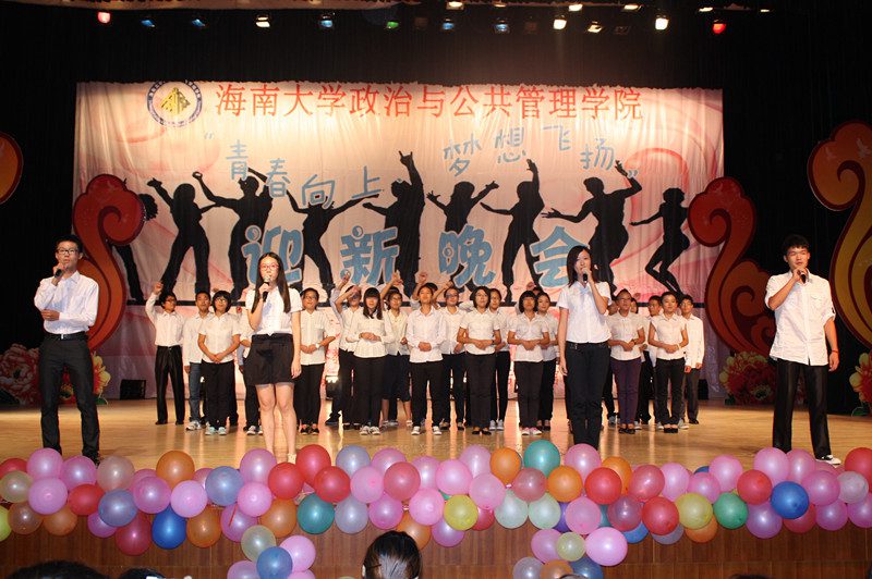 为欢迎2012级新同学的到来,营造开拓进取、锐意创新的思想氛围,展示学院深厚的文化底蕴、人文素养、青春活力,海南大学政治与公共管理学院于2012年10月21日晚,在思源学堂成功举办了一场以“青春向上,梦想飞扬”为主题的迎新晚会;政管学院党委副书记段捷频、副院长宋增伟,行政办、教务办、学工办、团委等职能部门负责人,各专业教师、辅导员,校学生会、各兄弟学院代表,与近千名同学一同观看。