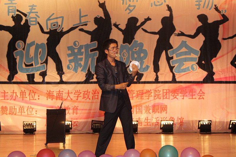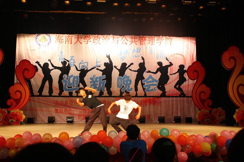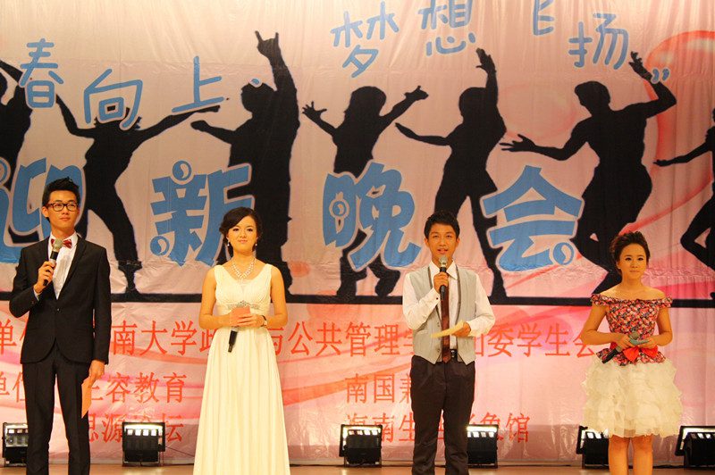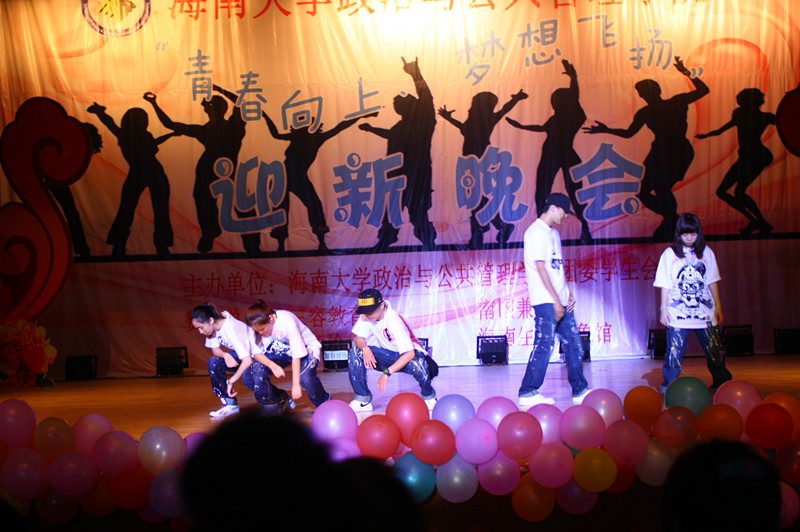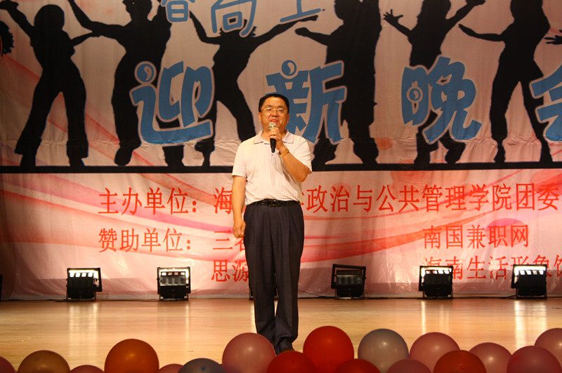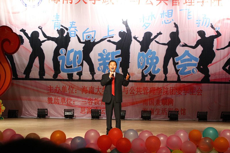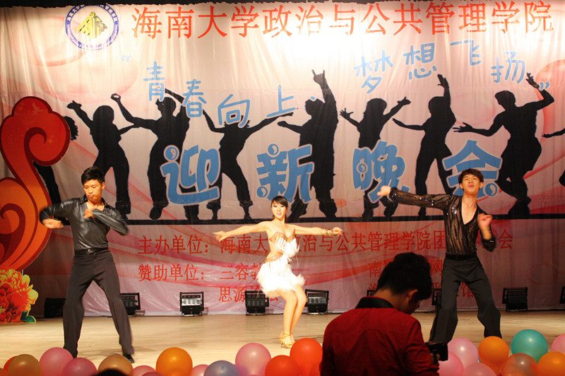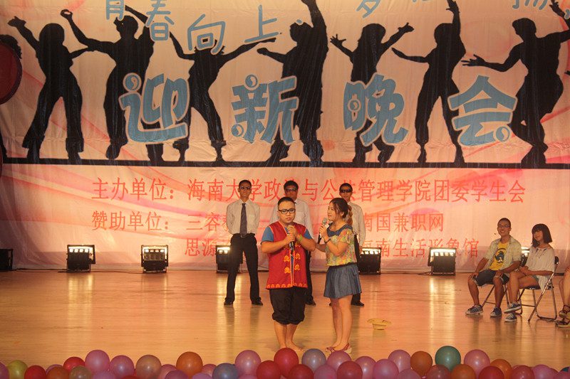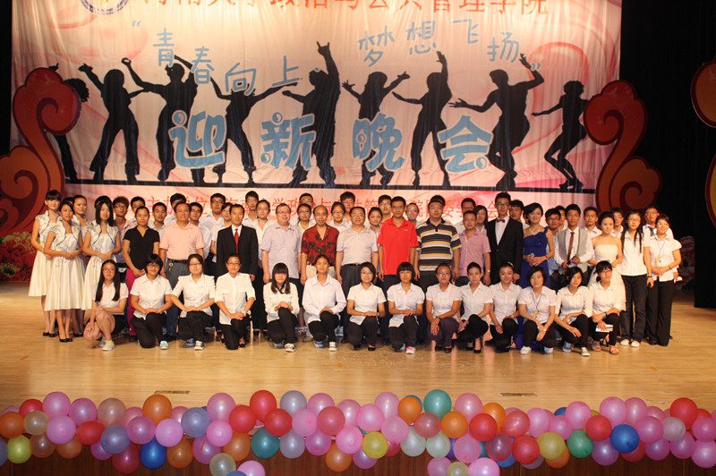 为欢迎2012级新同学的到来,营造开拓进取、锐意创新的思想氛围,展示学院深厚的文化底蕴、人文素养、青春活力,海南大学政治与公共管理学院于2012年10月21日晚,在思源学堂成功举办了一场以“青春向上,梦想飞扬”为主题的迎新晚会;政管学院党委副书记段捷频、副院长宋增伟,行政办、教务办、学工办、团委等职能部门负责人,各专业教师、辅导员,校学生会、各兄弟学院代表,与近千名同学一同观看。