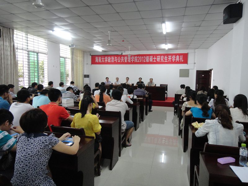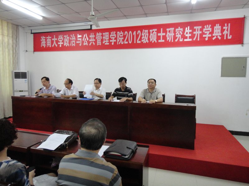 2012年9月8日上午8点,海南大学政治与公共管理学院在社科楼A-111多媒体报告厅隆重举行2012级研究生开学典礼,院长安应民,党委书记王默忠,党委副书记段捷频,副院长宋增伟、江红义,各硕士研究生导师,及院行政相关科室负责人出席;2012级研究生的80多名新同学一同参加。会议由副院长江红义主持。