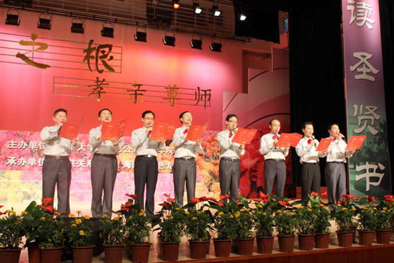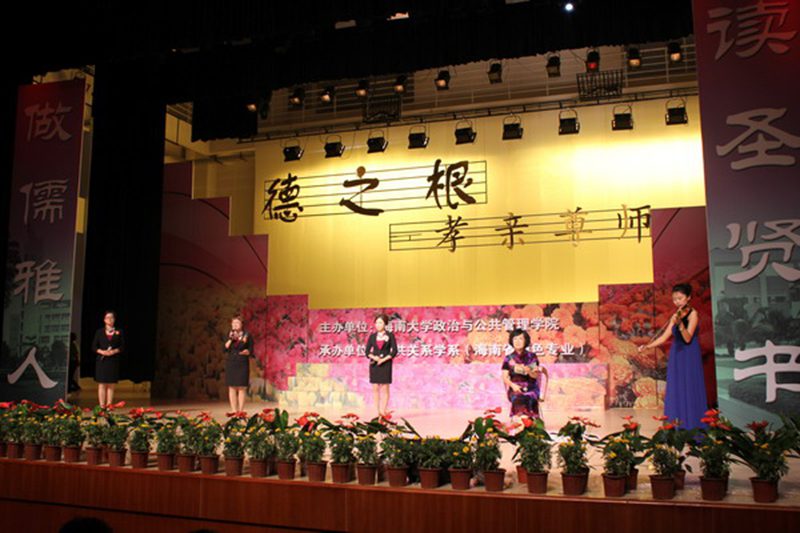 为紧扣海南大学“校园文化建设年”这一主题,树立特色鲜明的优良校风,打造先进的校园文化品牌,政治与公共管理学院于5月13日“母亲节”之夜,在思源学堂成功举办“徳之根——孝亲尊师”朗诵演唱晚会。校党委书记刘康德,副校长刁晓平、何忠平、傅国华,部分机关部门负责人和近千名师生观看了演出。