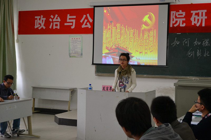 随后,来自于2010级政治学理论专业的林彩虹和饶松同学、以及2011级中共党史专业的张洋同学,紧密围绕着“如何加强与创新社会管理?”的话题,分别就“社会管理的内涵”、“加强和创新社会管理的必要性”,“我国社会管理的具体领域及管理现状”、“如何促进社会管理创新”,“加强与创新社会管理的经验总结”等方面的内容作主题发言。而莅临活动现场指导的各位专家教授们则结合研究生进行专业学习和开展学术研究的角度,一一进行了精彩地点评与深入地分析,并建议在座的研究生们要加强培养自身的问题意识、文本意识与社会责任感,使得大家获益匪浅和深受启发。全体与会师生还就社区管理、外来人口管理等多个问题,进行了详细地探讨与细致地交流。