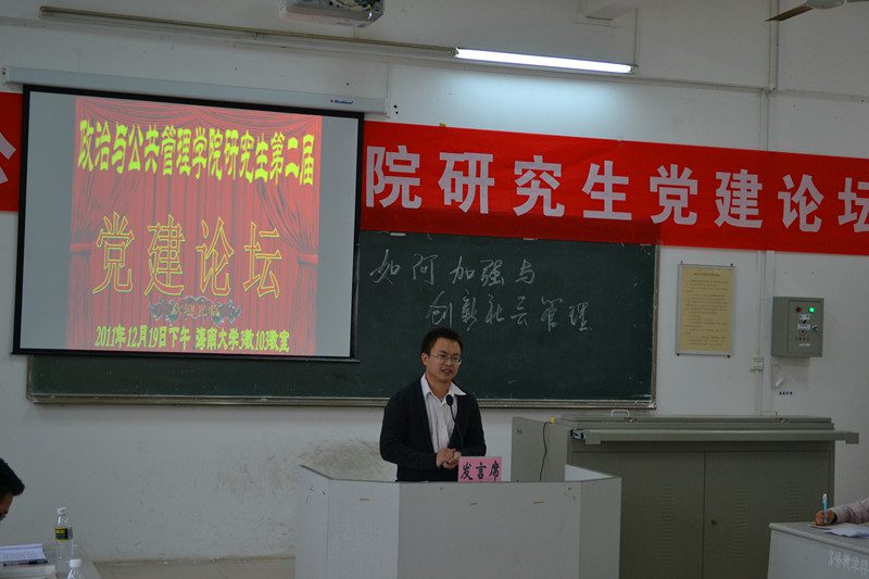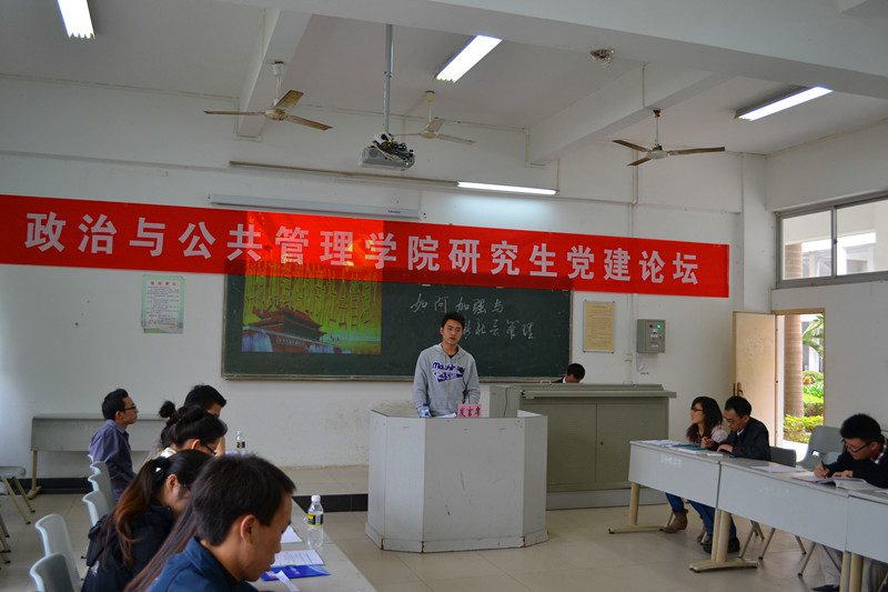 12月19日下午,由政治与公共管理学院研究生党支部联合研究生会共同发起举办的主题为“如何加强与创新社会管理?”第二届党建论坛在3教103多媒体电教室隆重召开。本次活动得到了学院党委的高度重视和精心指导,王默忠书记在百忙之中还抽空发来短信表示祝贺。出席本次论坛的学院领导有院长安应民教授、党委段捷频副书记、副院长宋增伟教授、副院长江红义副教授。硕士研究生导师庞京城教授和黄崇利副教授,团委曹艺涛书记,学生会主席李奇同学,兄弟学院研究生代表应邀指导。我院全体在校研究生一同参加,论坛由2010级研究生支部书记李白山同学主持。