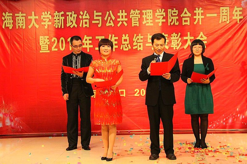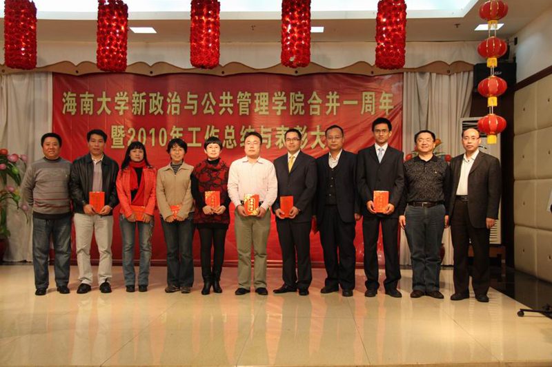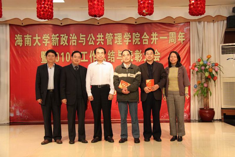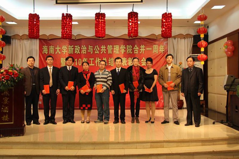 虎跃送佳绩,玉兔迎新年!2011年1月8日晚6点,海南大学政治与公共管理学院隆重召开合并一周年暨2010年工作总结与表彰大会。学校党委书记刘康德、党委副书记陈封椿、副校长刁晓平、学校机关部门有关领导应邀出席会议,学院党政领导和全体教职工参加了大会。大会由学院党委书记王默忠主持。