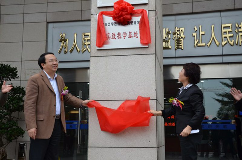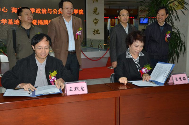 12月28日上午9点,海南省政务中心与海南大学政治与公共管理学院实践教学基地签字暨揭牌仪式在省政务中心大楼门前广场举行。省政务服务中心主任袁秀梅,我校副校长傅国华出席仪式并作讲话。袁主任介绍了政务中心的主要工作任务与职能特点,鼓励与会的师生多参与政务服务实践,树立坚定的为民服务理念。傅国华副校长代表学校对省政务中心对我校学生培养的大力支持表示感谢,并要求同学们珍惜机会,为以后的工作打下良好的实践技能基础。政治与公共管理学院全体领导班子、省政务中心各处负责人、审批办工作人员及学生代表共60余人参加了仪式。袁秀梅主任、王默忠书记代表双方在合作协议上签字。该基地的成立不仅为政管学院乃至全校师生提供了全省一流的政务服务实践教学研究平台,也是校政结合协同教育共同发展的实践,相信随着双方合作交流的不断加强,我校相关方向的实践教学一定会更加开阔、更加充实。