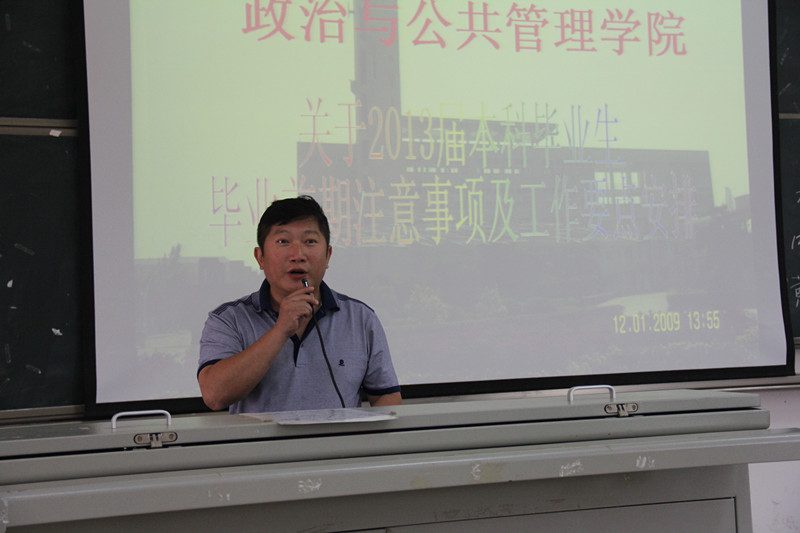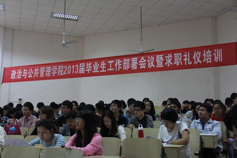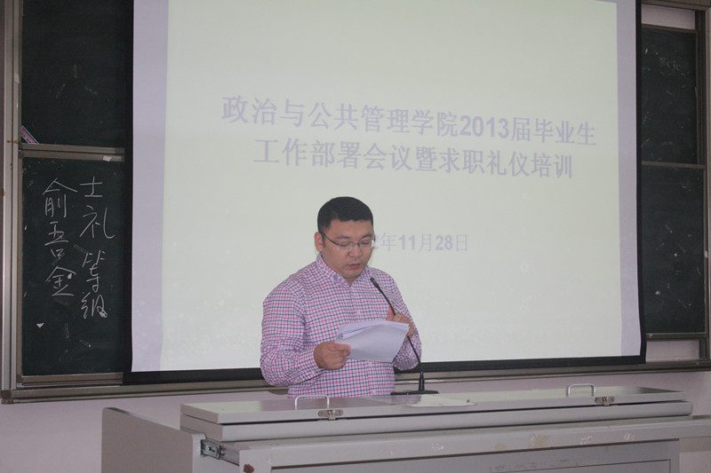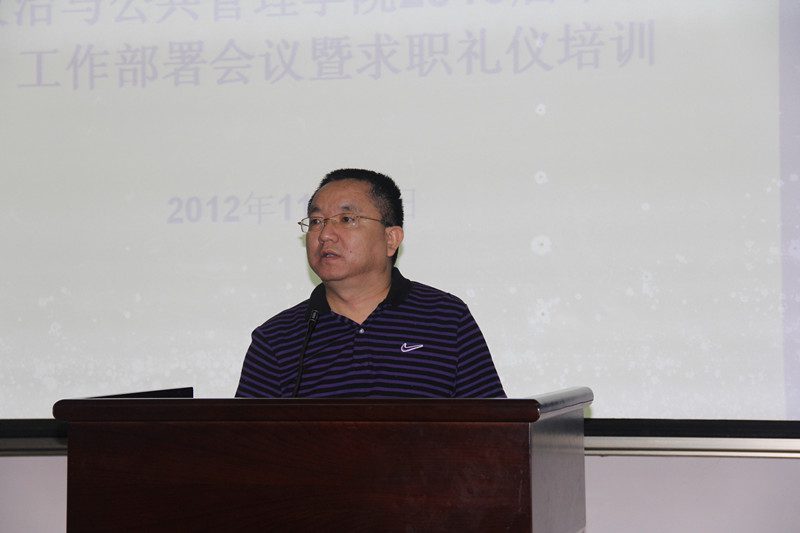2012年11月28日上午,“政治与公共管理学院2013届毕业生工作部署会议暨求职礼仪培训”在2号教学楼108多媒体教室举行。院党委副书记段捷频,副院长宋增伟,各系系主任,教务办主任、学工办主任、团委书记,各系辅导员,王芳副教授及全院300余名毕业生一同参加。会议由学工办邢红斌老师主持。