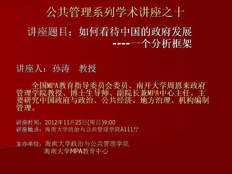 2012年11月25日上午,全国MPA教育指导委员会委员,南开大学周恩来政府管理学院博士生导师、副院长兼MPA中心主任孙涛教授在学院A111多功能报告厅为我校师生作了一场以“如何看待中国政府发展——一个分析框架”为主题的学术报告会。本场报告会由政管学院江红义博士主持,近百名师生一同聆听。