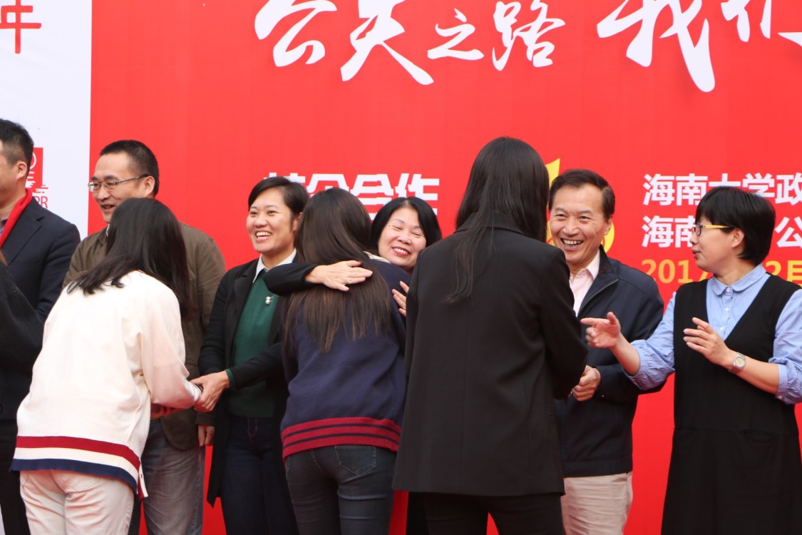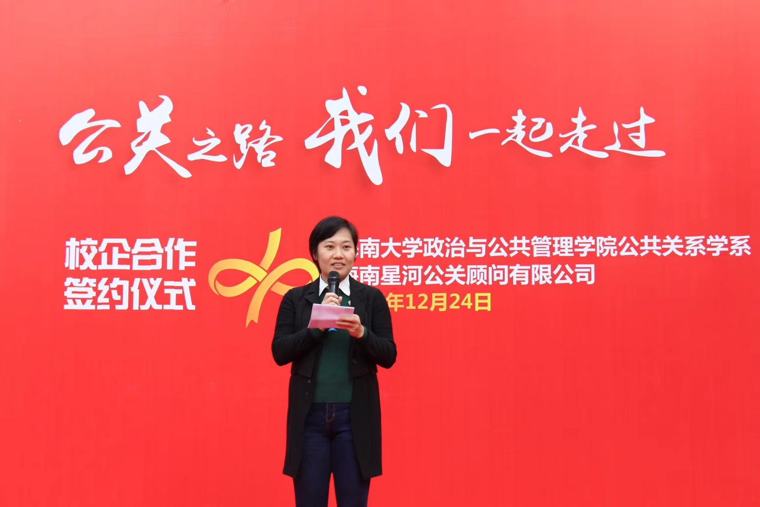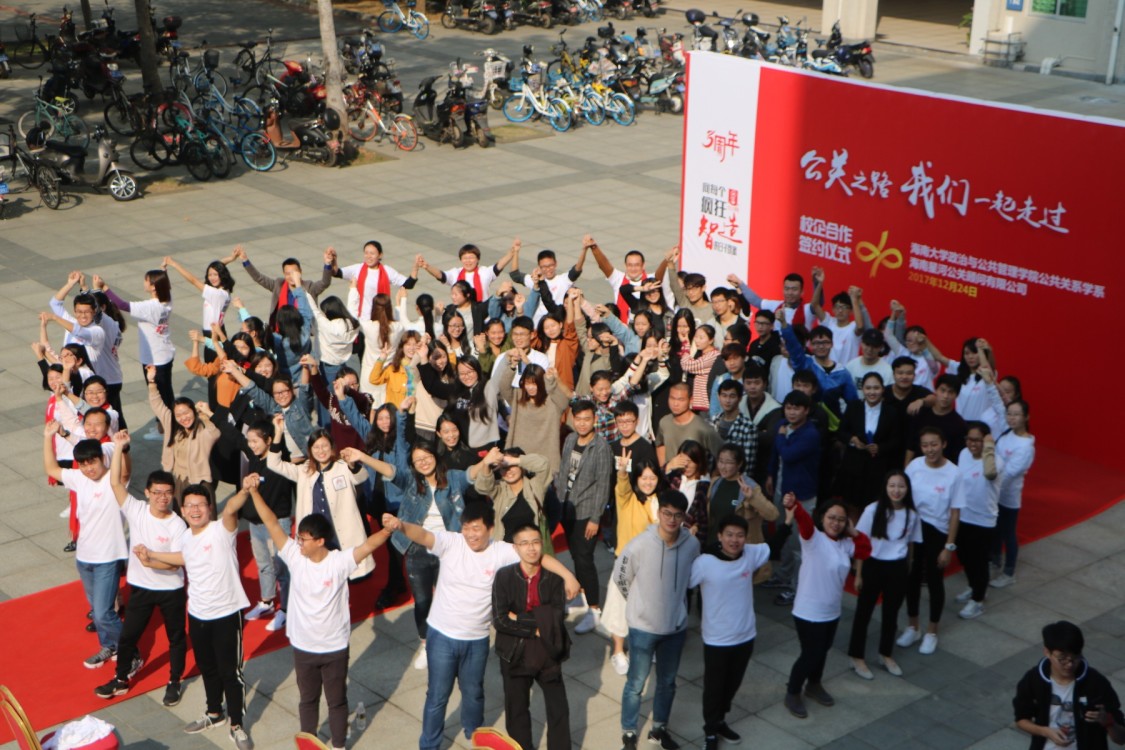 12月24日上午,政管学院公共关系学系公关一家亲——公共关系学专业新老生见面会暨院企合作签字仪式”在海南大学社科楼广场成功举办。出席活动的嘉宾有星河公关郭海霞执行董事长郝剑民总裁、刘倩董事,政管学院邢红斌副书记,系主任陈小桃、毕研韬、汪浩教授,郑崇明、王芳、黄燕梅副教授,15、16级公共关系学专业全体同学和17级公共管理学科部分同学。