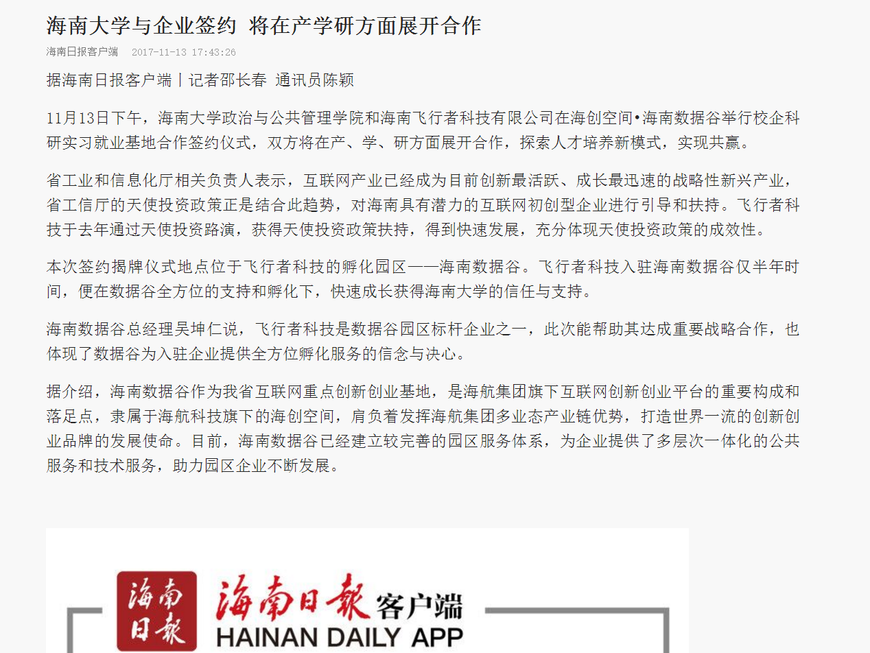 2017年11月13日下午,政管学院与海南飞行者科技有限公司在海创空间· 海南数据谷举行校企科研实习就业基地合作签约仪式,双方将在产、学、研等方面展开合作,探索人才培养新模式,实现共赢。政管学院、海南省工业和信息化厅、海南联合股权投资基金管理有限公司和海南数据谷等领导嘉宾受邀参加签约仪式。