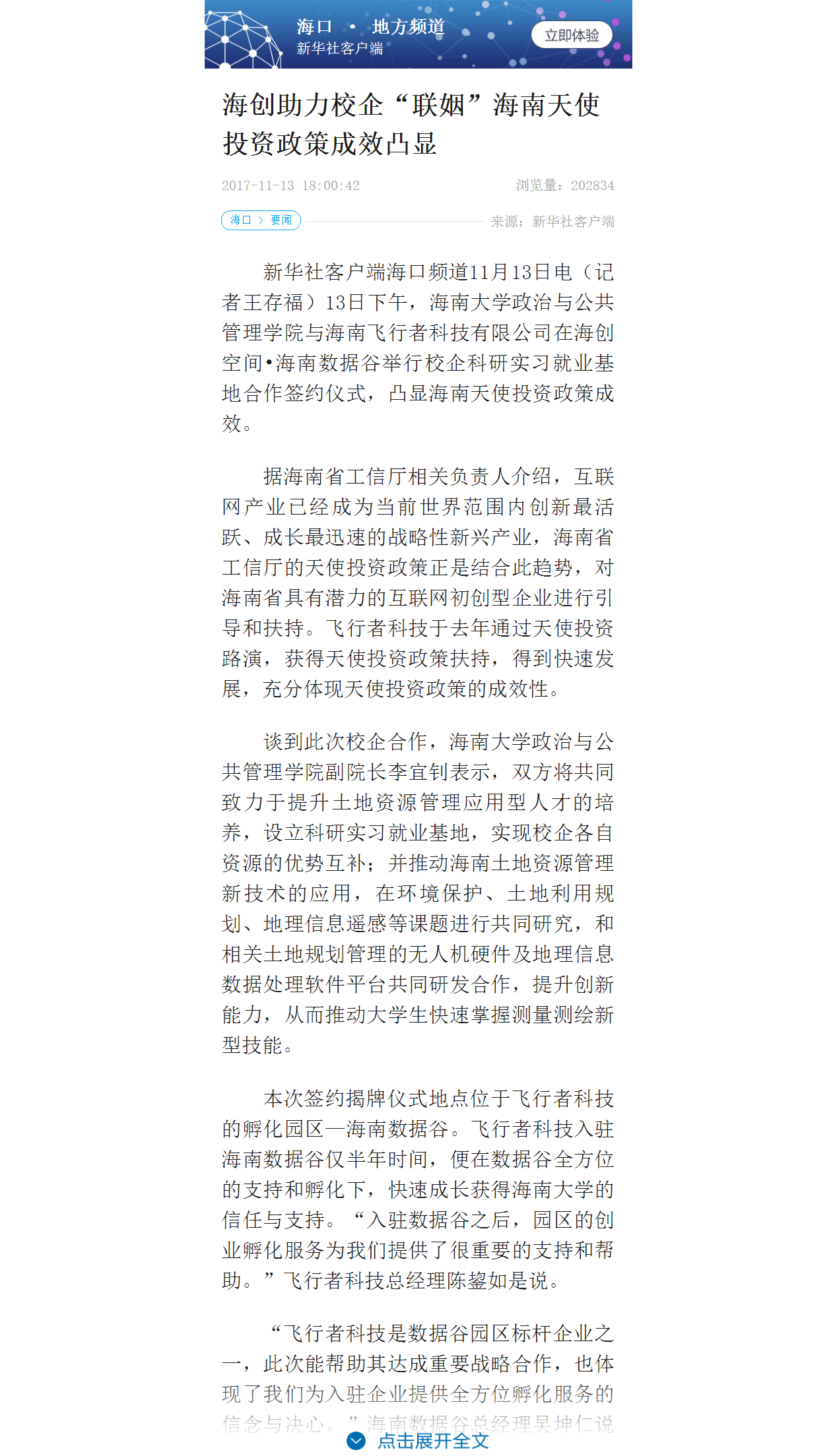 海南飞行者科技有限公司在2016年得到了海南天使投资的政策引导与支持而飞速发展,并在海南数据谷的全方位支持和孵化下,迅速成长为一家高科技公司。政管学院土地资源管理专业开设了地籍测量、地图制图、GPS与遥感等现代测量技术专业课程,与飞行者公司专业需求不谋而合。