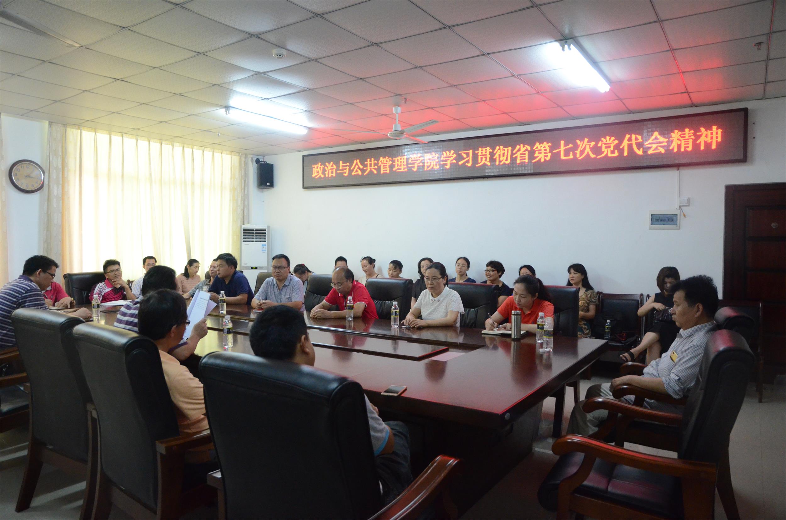 为深入学习领会海南省第七次党代会精神,5月2日下午,政治与公共管理学院在社科楼A213会议室召开传达学习贯彻执行海南省第七次党代会精神会议。政治与公共管理学院院长张治库,副院长江红义、李宜钊、周伟及全体教工党员参加了会议。会议由张治库院长主持。