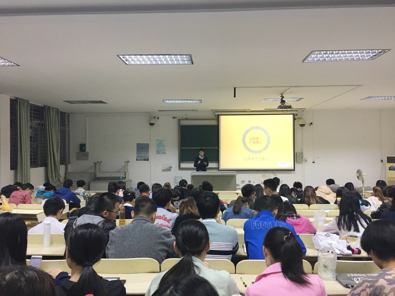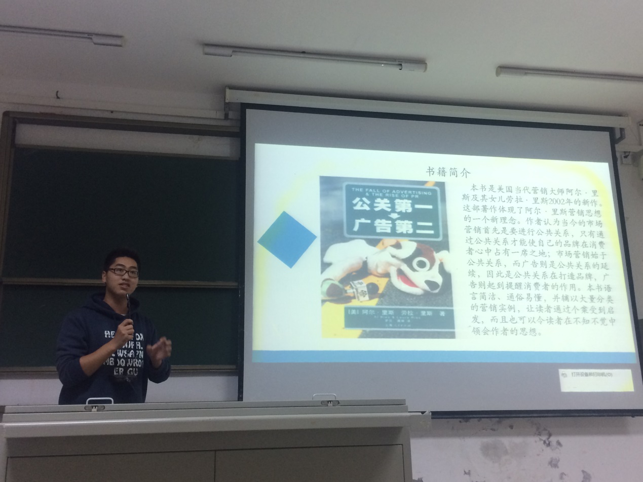 本次读书分享会的主题是对书籍《公关第一,广告第二》的读后感悟,此本书是由美国当代营销大师阿尔·里斯及其女儿劳拉·里斯所著,对公关与广告做了深入的解读,是公共关系专业学生的必读经典著作。对于本次分享会,同学们都非常积极,踊跃报名,并为此次活动做了充分的准备。七点三十分,主持人贾馨凝表示读书分享会正式开始。此次共有九位同学与大家分享读书心得,分别为公共关系学专业14级和15级学生。尽管专业相同,由于所处的学习阶段不同,他们所分享内容的广度和深度也不尽相同,但却各具特色,各有侧重,同样的精彩。