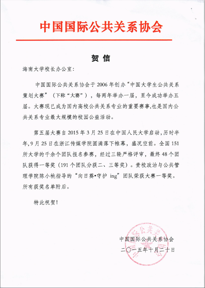 “中国大学生公共关系策划大赛”创办于2006年,每两年举办一届。第五届大赛自今年5月份在中国人民大学启动后历时半年在浙江传媒学院萍帷幕。我院团队“向日葵·守护ing”在陈小桃教授指导下荣获一等奖,中国国际公共关系协会发来贺信表达祝贺。