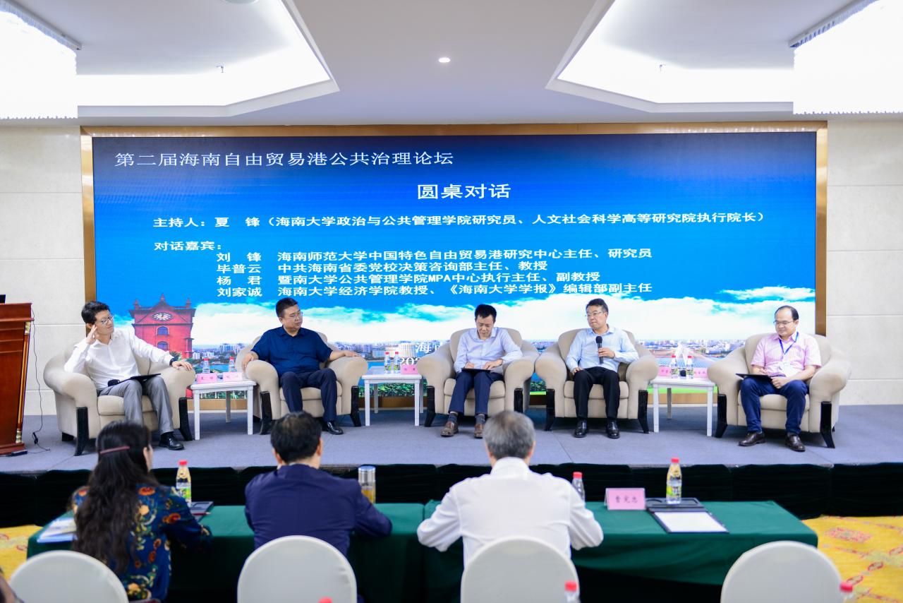 本次论坛设置了嘉宾对话环节,由海南大学政治与公共管理学院研究员、人文社会科学高等研究院执行院长夏锋主持。海南师范大学中国特色自由贸易港研究中心主任刘锋研究员、中共海南省委党校决策咨询部主任毕普云教授、暨南大学公共管理学院MPA中心执行主任杨君副教授、《海南大学学报》编辑部副主任刘家诚教授围绕海南自贸港营商环境、人才引进、制度集成创新、改革与开放的关系等问题进行了深入交流。