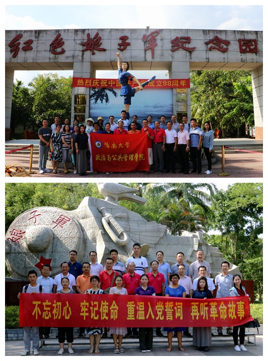 主题党日活动中,全体教师党员先后参观了红色娘子军纪念园、周士第将军纪念馆、椰子寨战斗遗址,以及美丽乡村沙美村、中国(海南)南海博物馆。开展了重温入党誓词、学习琼崖革命精神、缅怀革命先烈、接受革命传统教育及“庆七一,唱红歌”比赛等活动。通过参观学习,广大党员加深了对海南红色历史文化的了解,领略了海南美丽乡村建设的范式,初步了解了南海人文历史、自然生态和海上丝绸之路沿线国家和地区的大致情况。党员们纷纷表示将沿着革命先烈的足迹继续前进,铭记历史,不忘初心,开阔视野,以崭新的姿态,争取创造优质的成绩迎接新中国成立70周年。