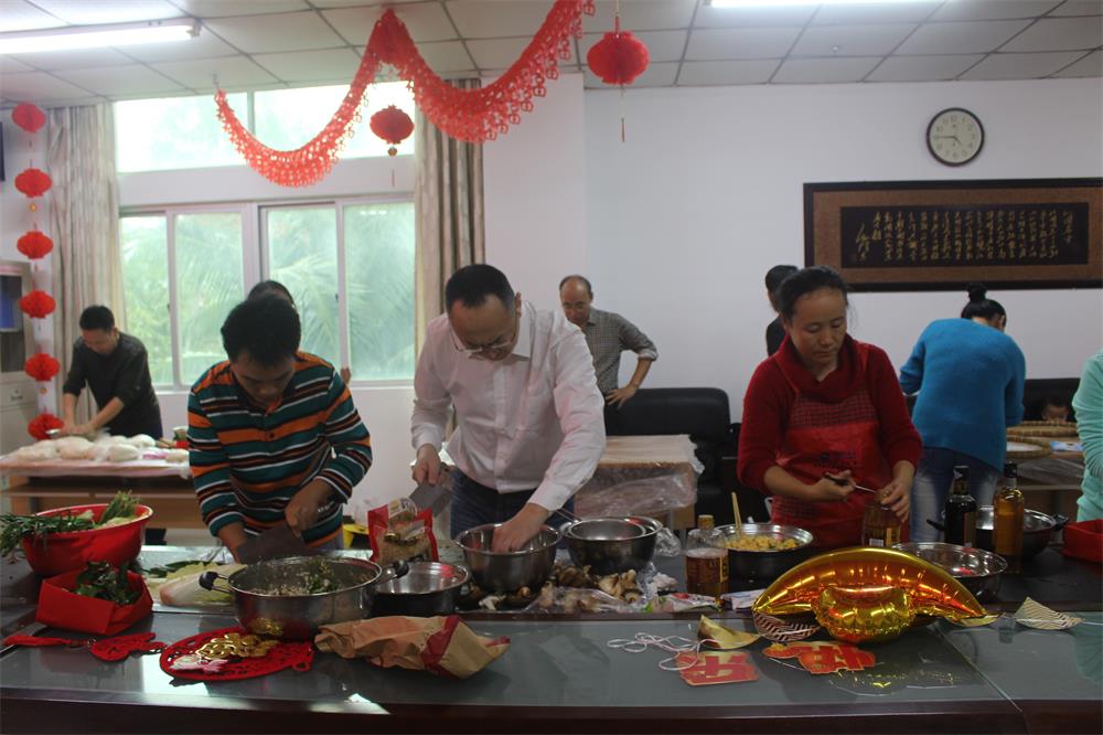 福字彩带、大红灯笼,现场一片喜庆祥和的氛围。老师们早早地来到社科楼做起了准备工作。择菜、洗菜、和面、饧面、剁馅、调味、煲汤,老师们各显身手,不一会便准备妥当。饧好的面被揪成一个个面剂子,随着擀面杖在面板上飞快地滚动,面剂子便延展开来成了面皮儿。面皮在老师们的巧手中变成各式各样的饺子,既有小巧精致的月牙饺子,也有才思满溢的创意水饺。老师们自发围成四桌,揪面剂子、擀面皮、包饺子,配合默契。一篦篦水饺被下到锅里,一会儿便随着沸水上下翻滚,热腾腾的饺子便出锅了,丰盛的晚宴正式开始。席间,各位老师不时互相交流,笑语欢声,其乐融融。晚宴之后,学院党委书记、工会主席王默忠总结了上一年的工作,表彰了工作突出的教职工并为他们颁发奖品,活动在欢乐祥和的氛围中落下帷幕。