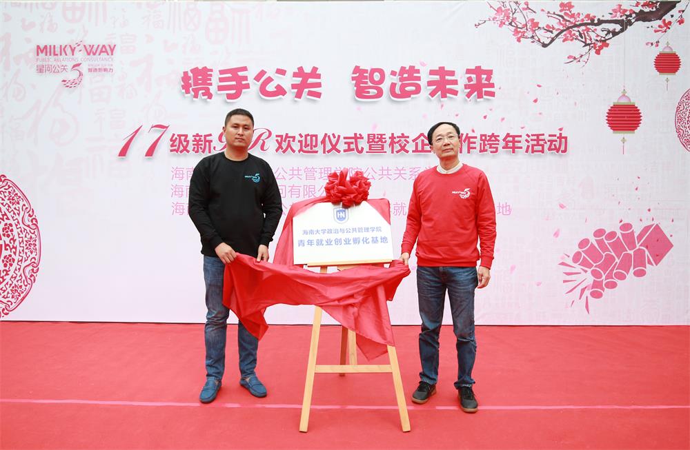 为表示海南大学公关系与星河在2019年将走向更深层次的合作关系,海南大学政治与公共管理学院王默忠书记与星河公关刘恒总经理,共同签署合约,并为“青年就业创业孵化基地”揭牌。星河公关一如既往,发挥实践优势,建立创新创业孵化基地,并启动“星5计划”,在星河跨入第5年之际,以传承和创新的精神,鼓励更多有想法和实战能力的海大学子进入基地成立工作组,星河将为学生们提供更优质的创业指导。