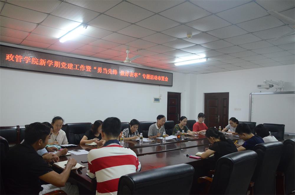 8月28日下午,政管学院在社科楼A213会议室召开新学期党建工作暨“勇当先锋,做好表率”专题部署会。学院党委书记王默忠、副书记邢红斌,各党支部书记及学生党建联合会委员参加了会议,会议由王默忠书记主持。