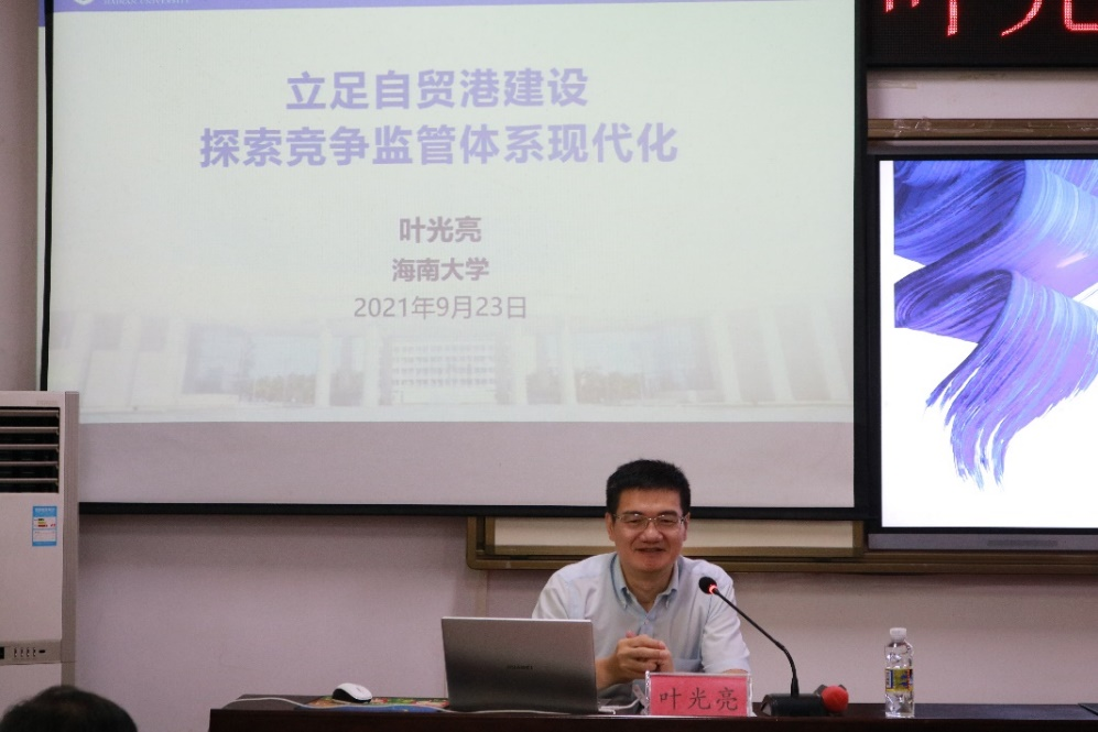 叶光亮教授以“立足自贸港建设,探索竞争监管体系现代化”为题,详细阐述了海南自由贸易港建设的现状和前景。他首先为大家介绍了自贸港“6+1+4”的制度设计,充分展示了海南作为高水平开放窗口的制度优惠与突破。接着,叶光亮教授为大家讲解了竞争政策的历史与发展现状,以生动可感的案例引导同学们理解和思考竞争政策建立的必要性与重要性。他指出,高水平开放离不开基于竞争政策的高质量监管,建设基于人工智能和区块链的公平审查技术体系与平台将成为解决审查需要的良方。同时,叶光亮教授强调,公共管理类专业人才在自贸港政策建设中大有可为,并对我院学生寄予殷切希望,鼓励学生树立高远志向,热情投入自贸港建设的队伍,以跨学科的交叉视角为自贸港建设作出贡献。